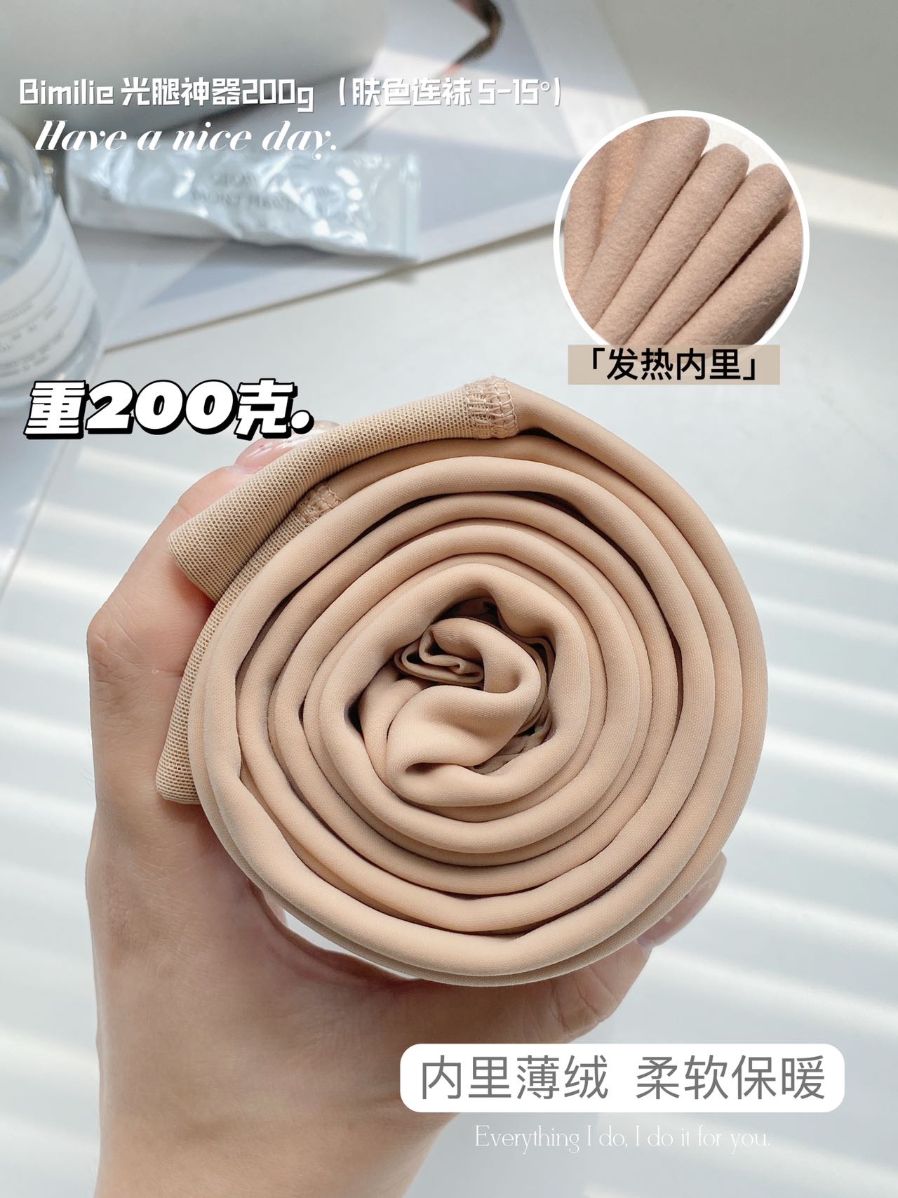 Bimilie光腿神器200g运用高密织纱线,打造99.9%自然光腿裸感,让你彻底告别假白尴尬。其特别的发热薄绒设计适合5-15℃的环境,不仅轻薄保暖,还具备快速的遮暇美肤和微压塑形功能。无感穿着、高弹力腰部和U型提臀线弧形设计出色结合,提供舒适的贴身体验,同时显瘦显高,轻松打造自然、纤细的腿部线条。无论是日常通勤还是户外活动,都能让你随时自信满满。